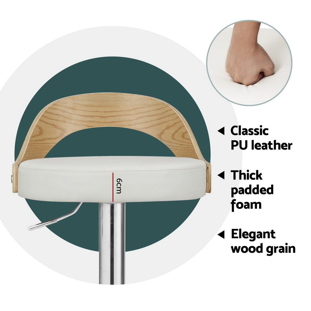 Our Oliver Leather Bar Stool is an adjustable height stool with a white polyurethane leather seat featuring a mid-height curved backrest with a wood grain design.