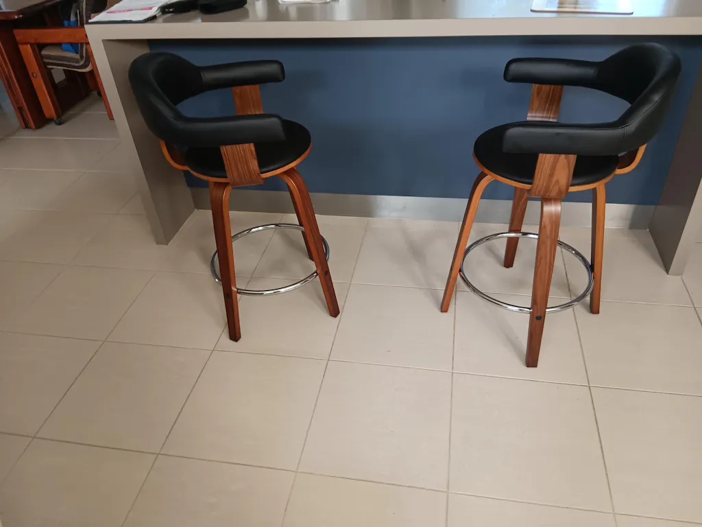 This counter stool has a generously padded polyurethane leather seat with a 360-degree swivel along with a backrest and armrests for maximum comfort. Supported with a strong and durable bentwood frame with heavy-duty fixings made to last. Fitted with a circular chrome steel footrest and anti-slip floor protectors for added stability.