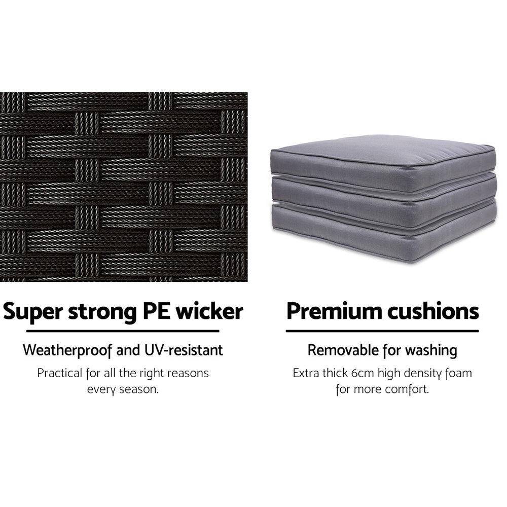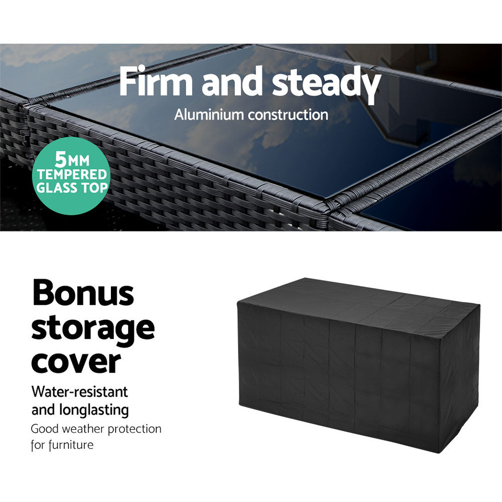 Looking as stunning as ever in an upgraded design, our Outdoor Bar Set certainly deserves its coveted space in your lovely backyard, deck or patio. With its chic and trendy profile, the bar set comes with a table and matching bar stools, with ample seating for all your friends and family. And as the seats have inclined backrests and extra-comfy 5cm thick foam cushions, you can socialise for hours on end without aching backs or bottoms. If you spill your drink, the 5mm tempered glass tabletop and removable seat cushion covers make cleaning up hassle-free. With powder-coated steel construction and quality PE wicker finish, the bar set is designed to handle the rain and sun without any worries for years to come, and there is also a bonus water-resistant storage cover included for added protection. When not in use, you can save loads of space simply by pushing the chairs under the table, as the bar set has a space-saving integrated design and fits together perfectly like a puzzle.