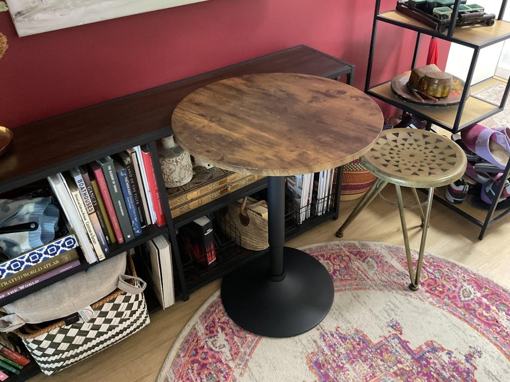 This bar table is height adjustable so I use it as my dining table for one. Any it can slot into my bookcase when not in use.