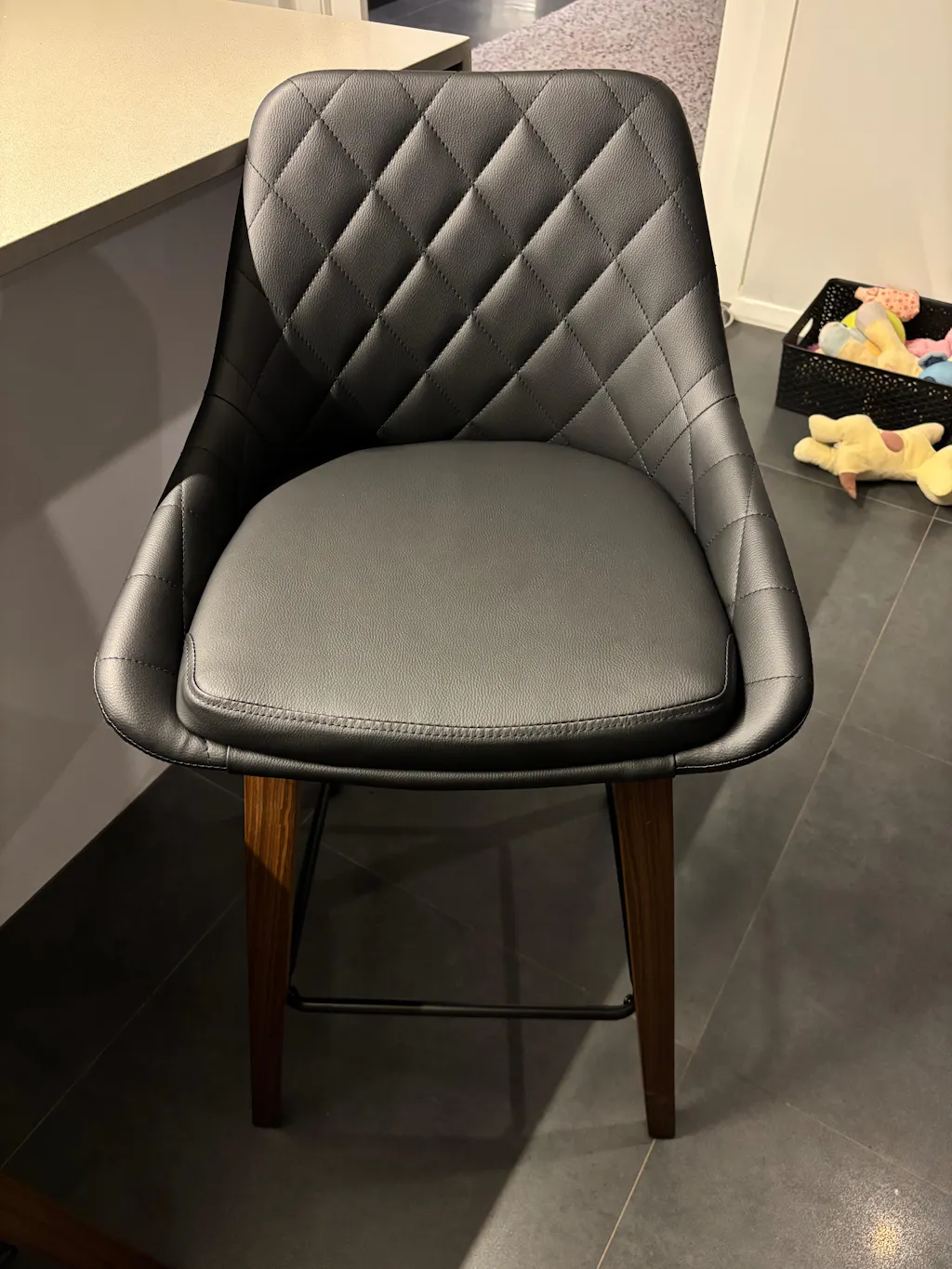 The seat is upholstered in premium polyurethane leather that is generously padded with a full-height backrest for ultimate comfort. The frame is made from wood veneer with a stunning walnut finish with an all-around powder-coated steel footrest. Fitted with anti-slip rubber pads on the bottom of the legs for stability and to protect your floors.